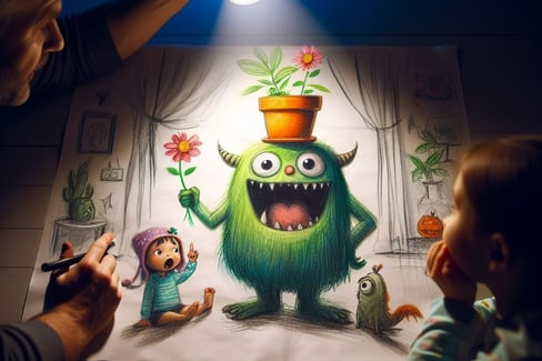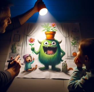 Piensa en algo que te dé un poquito de miedo en la oscuridad, como un fantasma, una araña, o cualquier monstruo que imagines. Dibuja tu miedo en el papel y luego inventa una historia divertida sobre este personaje. ¿Cómo se llama? ¿Qué cosas divertidas puede hacer?