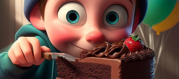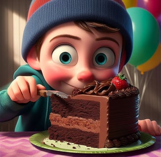Se lo estaban pasando genial y la tarta había quedado muy bonita. Cuando terminaron, le dijo que no la tocara porque el chocolate estaba todavía muy caliente y la tarta tenía que reposar para que no se desmontara. Pero él no escuchó, de nuevo, el "no tocar", y ¿qué hizo? No pudo esperar más a probar aquella deliciosa tarta. Así que, cuando su abuela se marchó de la cocina, él con sumo cuidado mordió un pedacito. Total, pensó, un solo bocadito no se notará.